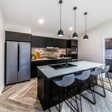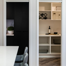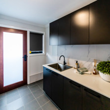 The kitchen features a large island providing seating with the dishwasher under the island and the black overmount sink and tapware complementing the black, white and grey colour scheme. A gas cooktop and a tower with an oven and microwave give the chefs in the family ample room to cook and to create as does the addition of a spacious white melamine Butler’s pantry with an abundance of storage and bench space.