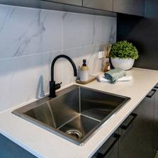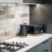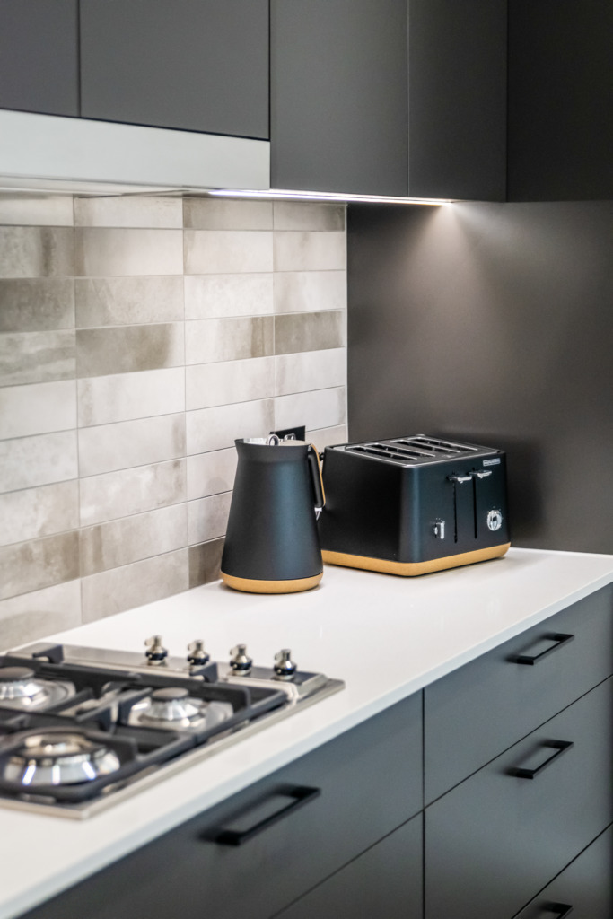 The sleek lines of the kitchen are maintained with bulkheads to the ceiling and underhung and push to open overhead doors which require no handles. LED lighting under the overhead cabinets brightly illuminates the benchtop area.