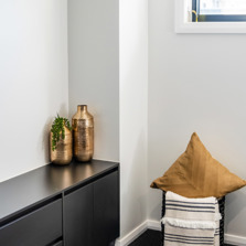 Most of the joinery in the kitchen and laundry features Polytec Cinder Matt decorative finishes and 20mm Smartstone Astral engineered stone. The sleek entertainment units use the same Cinder Matt finish to continue the look and style throughout the house.