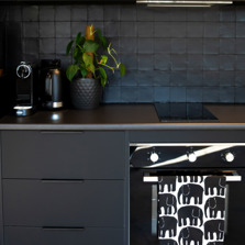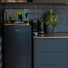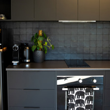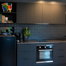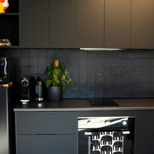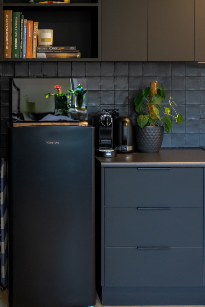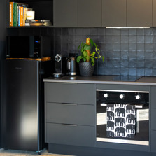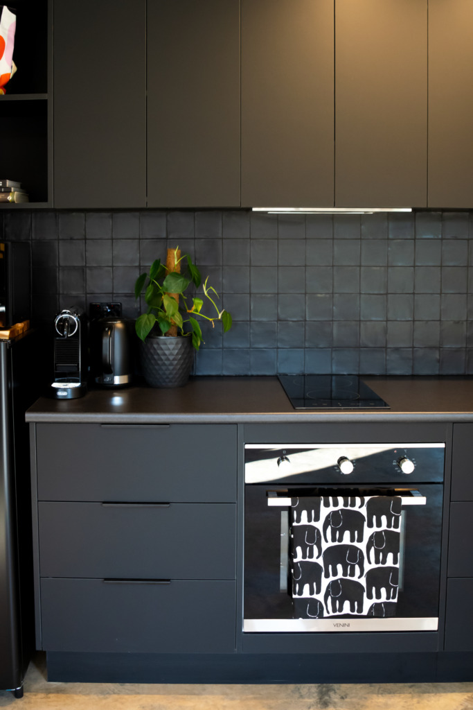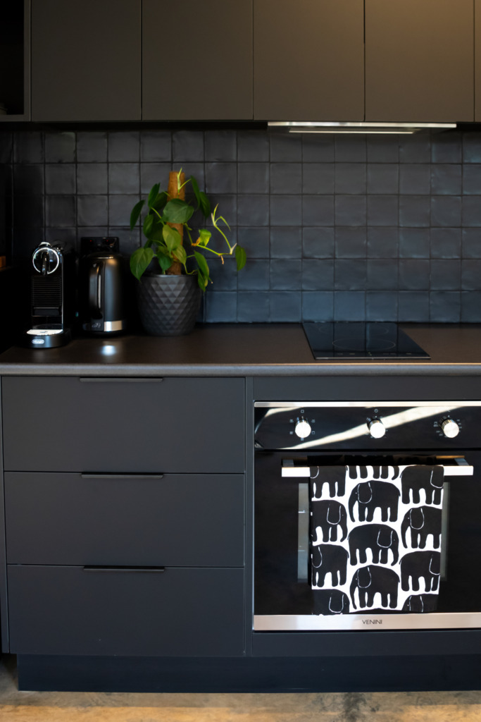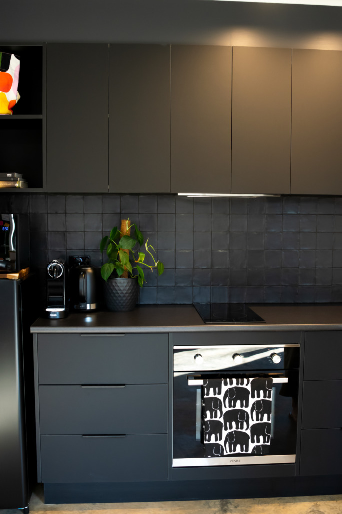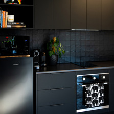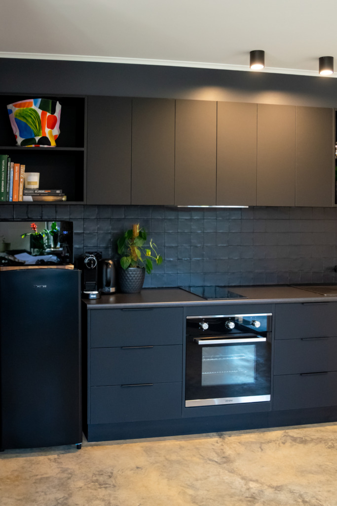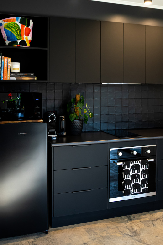 This functional, yet very stylish space showcases a kitchenette featuring silky smooth, hard-wearing, fingerprint-resistant Polytec Black Venette and Laminex Ebony Oxide laminate benchtops. These complement the polished cement floor and black tiled splashback to create a modern, industrial-style look. The minimalist Momo black handles and the black Hafele sink and tapware complete this look. Functionality and ease of use are also ensured by Grass soft close drawers and Titus hinges. Just because a space is small, it does not have to be boring!