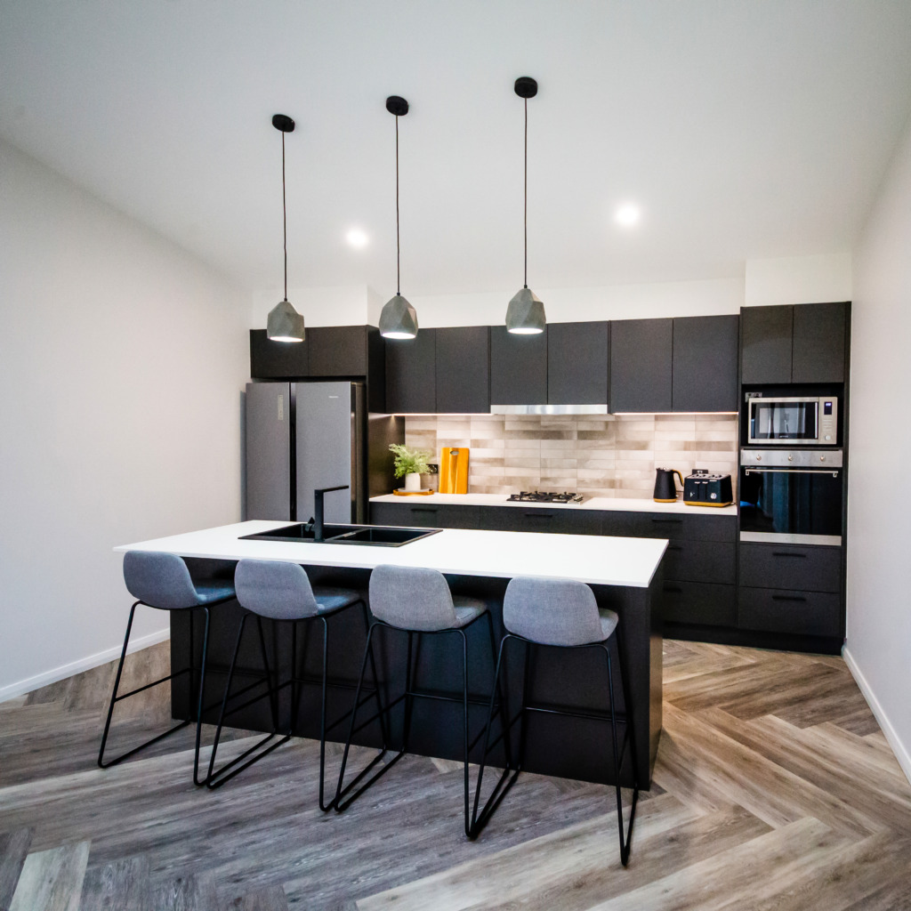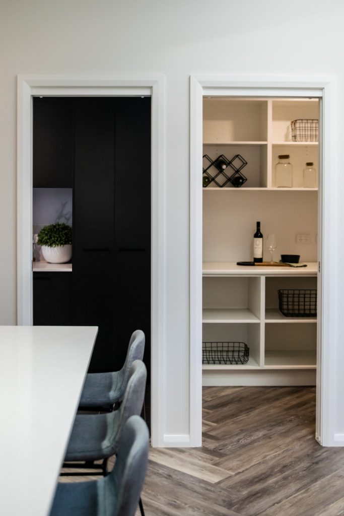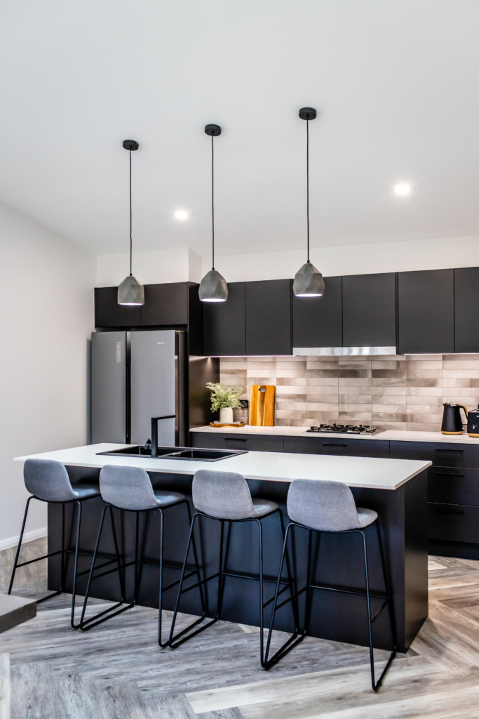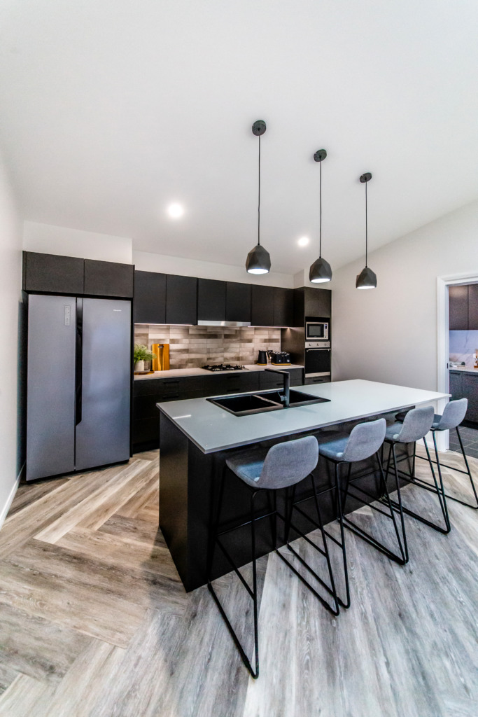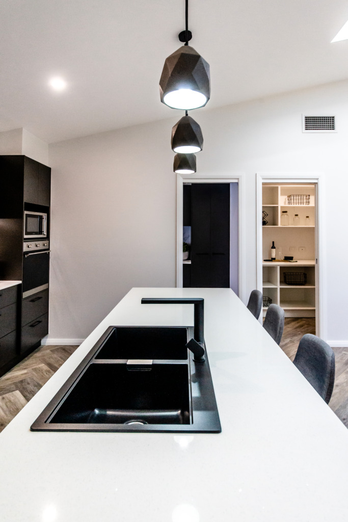 The kitchen features a large island providing seating with the dishwasher under the island and the black overmount sink and tapware complementing the black, white and grey colour scheme. A gas cooktop and a tower with an oven and microwave give the chefs in the family ample room to cook and to create as does the addition of a spacious white melamine Butler’s pantry with an abundance of storage and bench space.