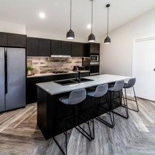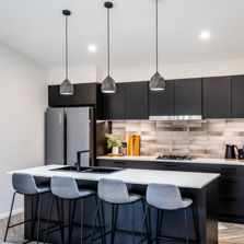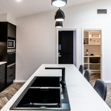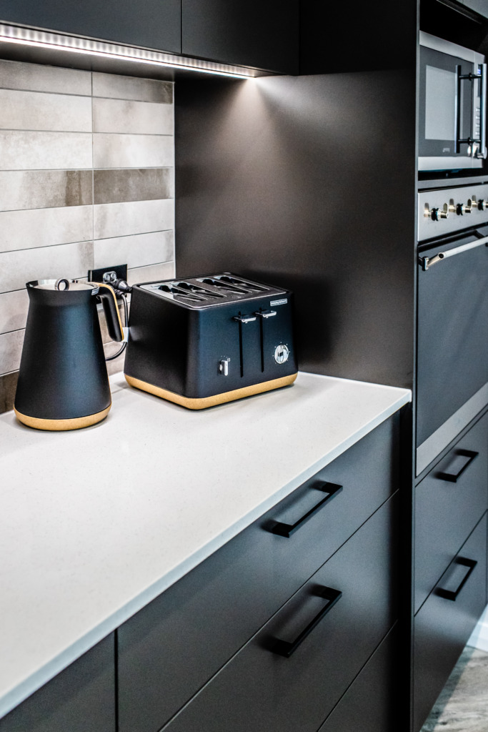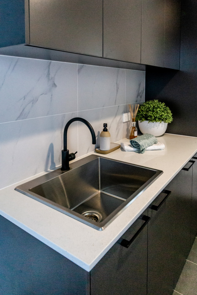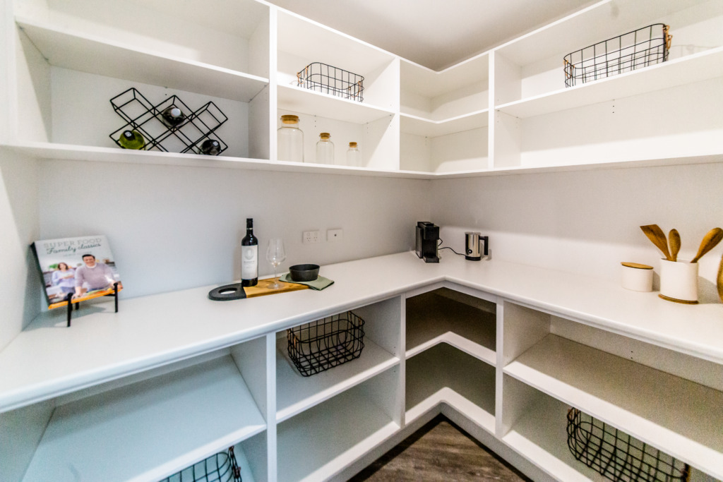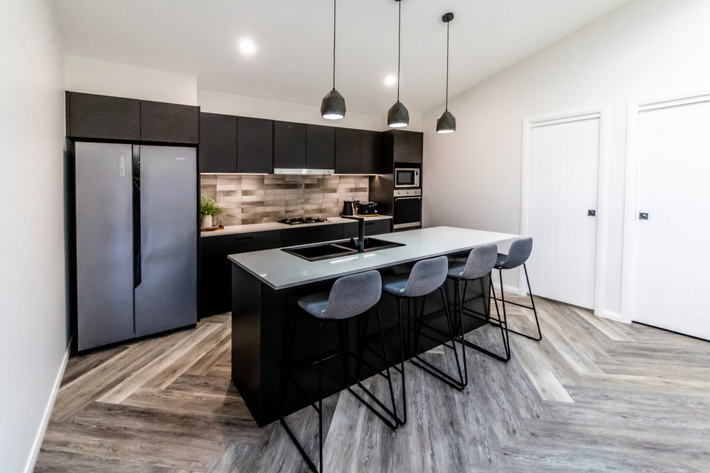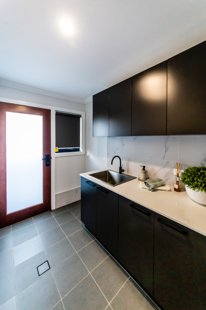 The kitchen features a large island providing seating with the dishwasher under the island and the black overmount sink and tapware complementing the black, white and grey colour scheme. A gas cooktop and a tower with an oven and microwave give the chefs in the family ample room to cook and to create as does the addition of a spacious white melamine Butler’s pantry with an abundance of storage and bench space.