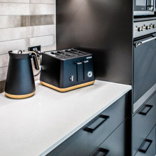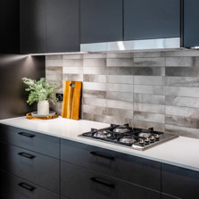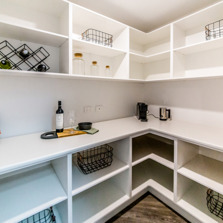 The sleek lines of the kitchen are maintained with bulkheads to the ceiling and underhung and push to open overhead doors which require no handles. LED lighting under the overhead cabinets brightly illuminates the benchtop area.