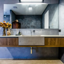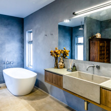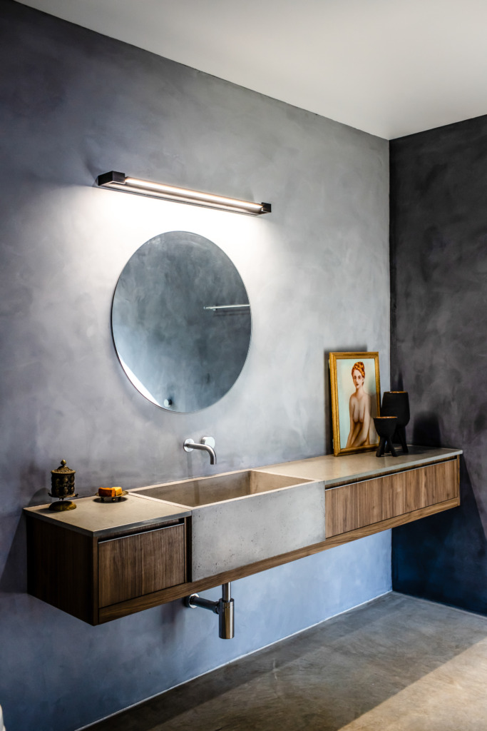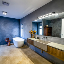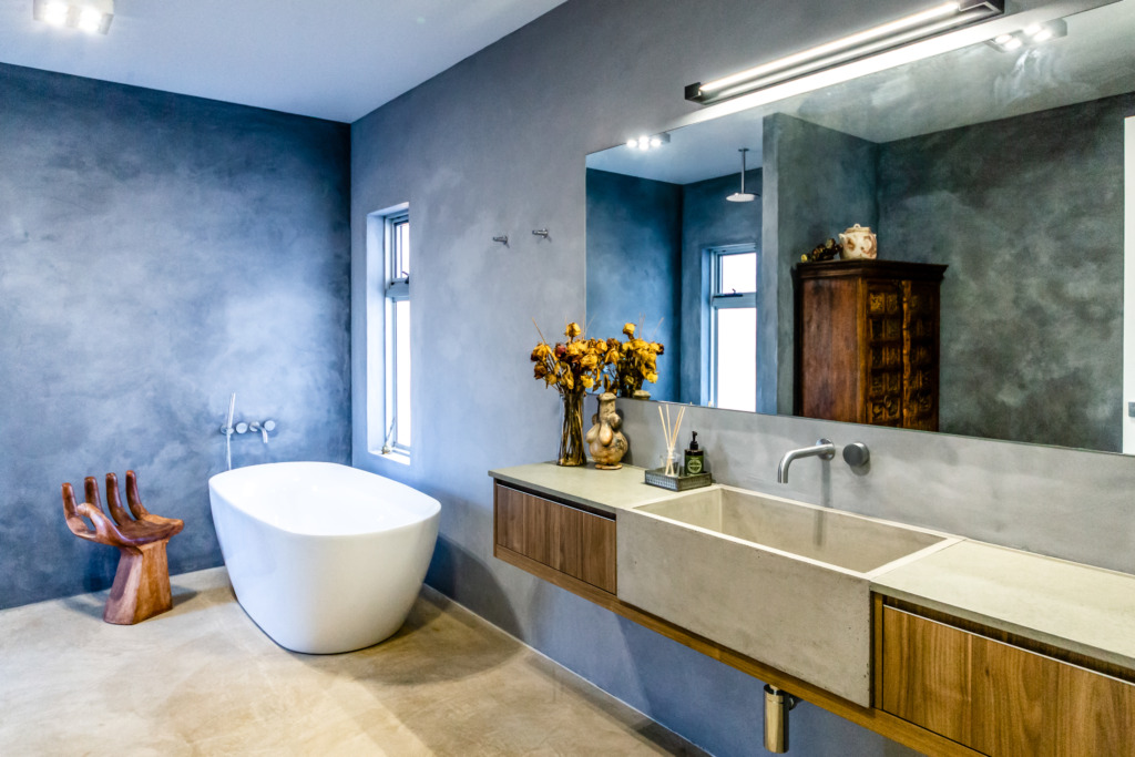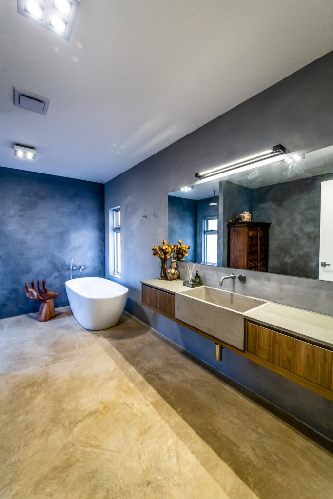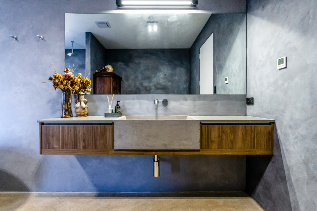 The generous wall-hung vanity units also feature Poytec Nataio Walnut Woodmatt decorative finish and Butler’s style sinks set in Quantum Quartz Naturale Concrete engineered stone benchtops. These complement the polished concrete floors and the very special Marrakesh plaster used in areas throughout the house.