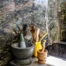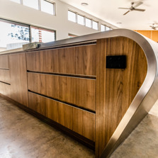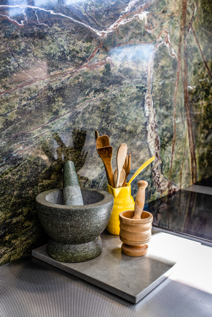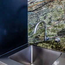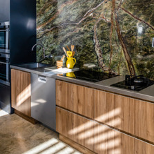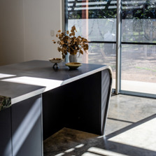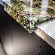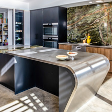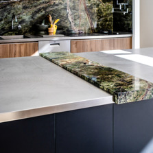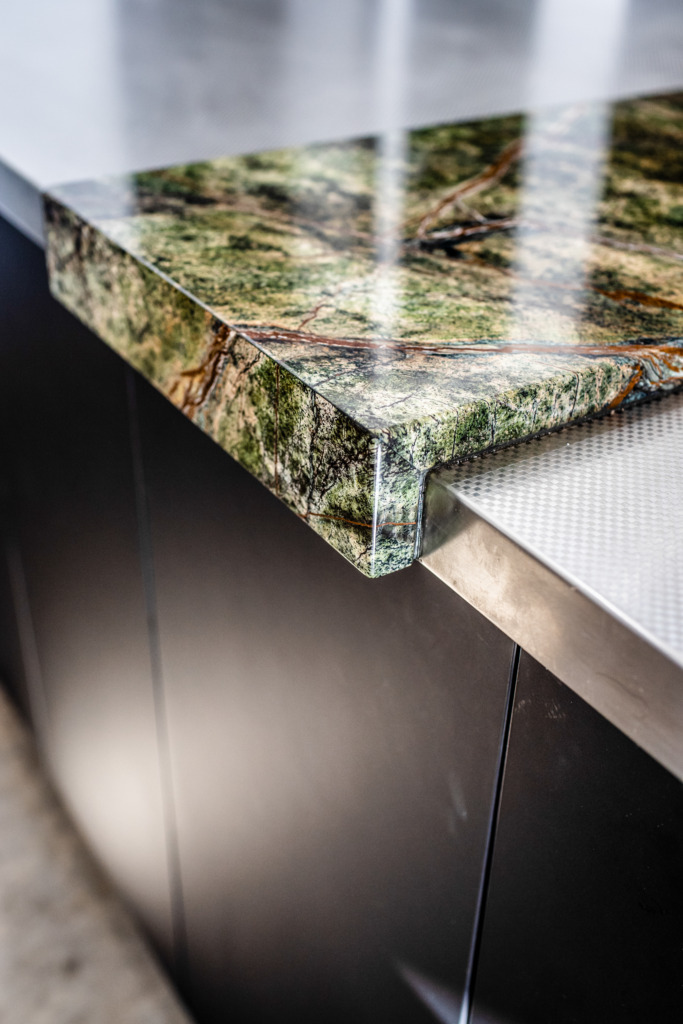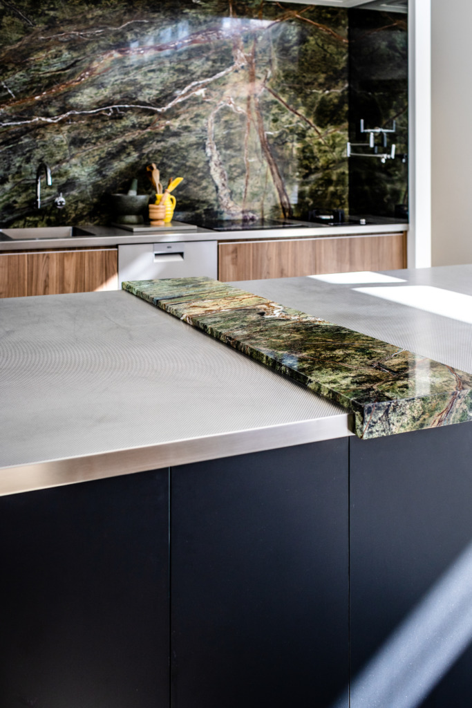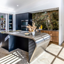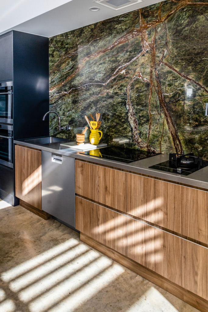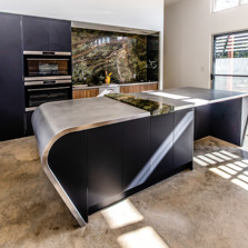 The warmth of the Forest green marble and the Polytec Natural Walnut Ravine contrasts with the industrial look of the polished concrete floors, the curved stainless steel benchtop and Black Venette decorative but all the elements come together wonderfully in this breath-taking space.