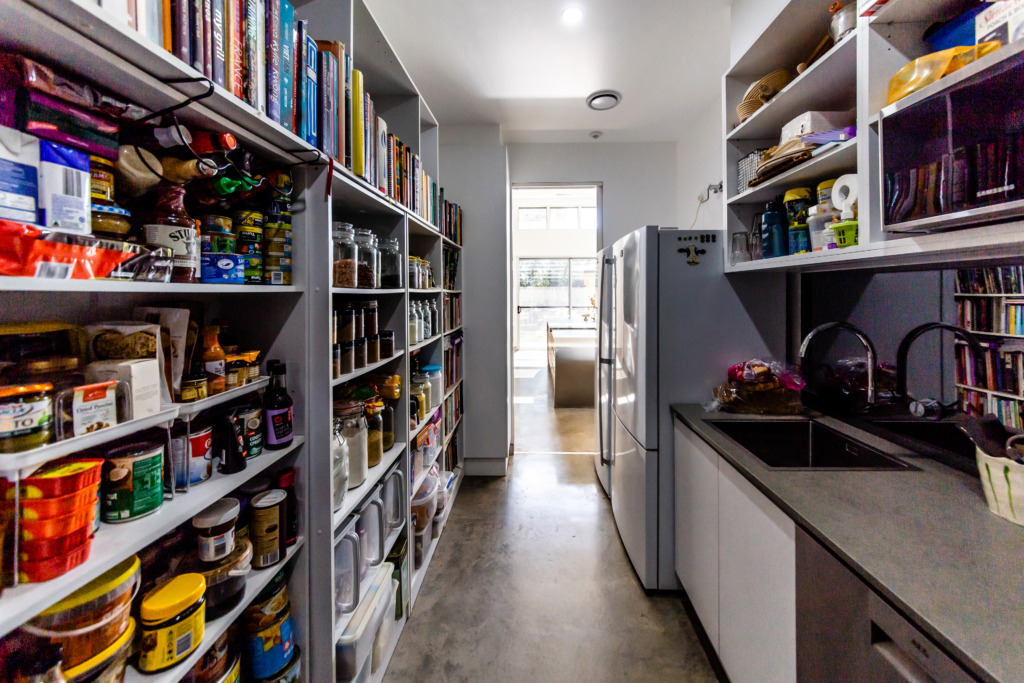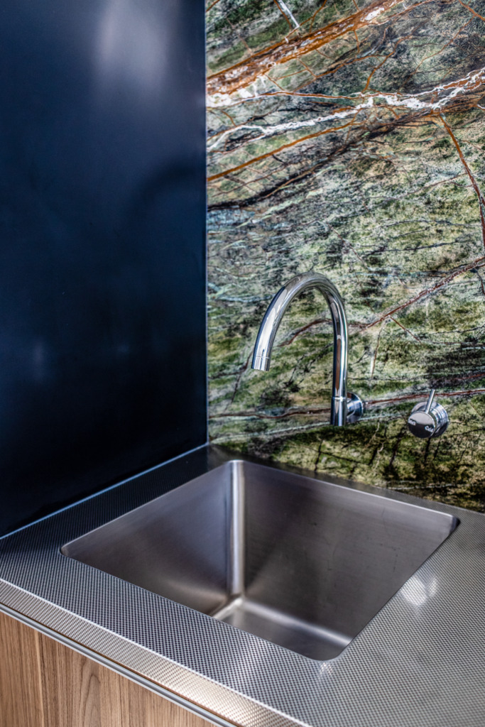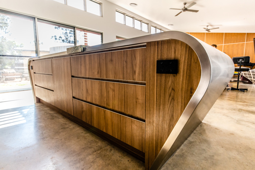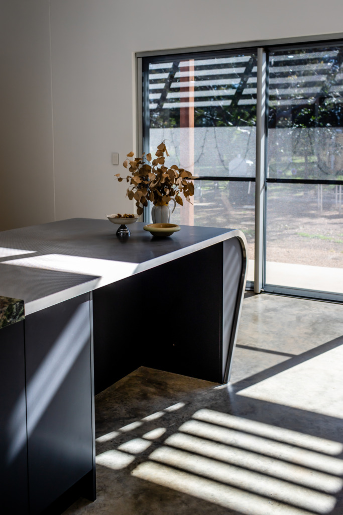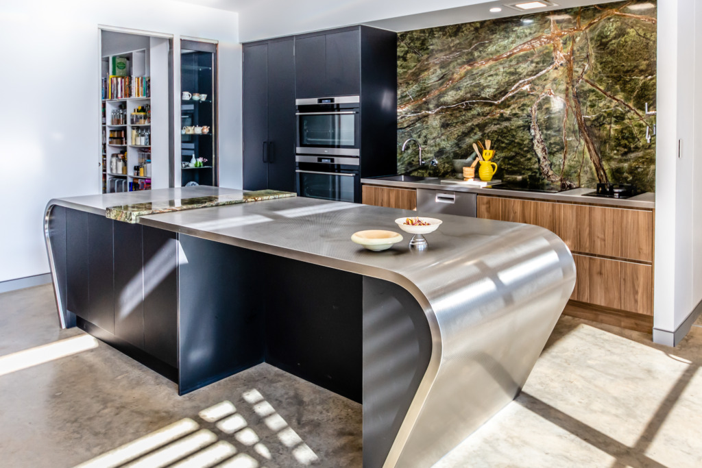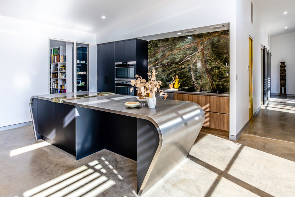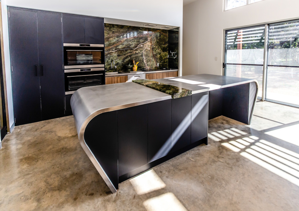 The light-filled kitchen features joinery and materials that complement the industrial style polished concrete floors. The particularly impressive elements in the kitchen are the curved island Rimex stainless steel benchtop in a Checks pattern and the Forest Green natural marble splashback. The stainless steel island benchtop incorporates a piece of marble as a feature that helps tie the benchtop to the splashback. The island and the rest of the kitchen use a combination of Polytec Nataio Walnut Woodmatt and the ultra matt Polytec Black Venette for the decorative finishes while the sleek lines are ensured by the use of Polytec aluminium finger pull fittings on most of the joinery. A Butler’s pantry with a Hafele sink and Loox lighting ensures plenty of storage and workspace for the kitchen.