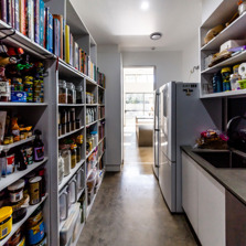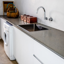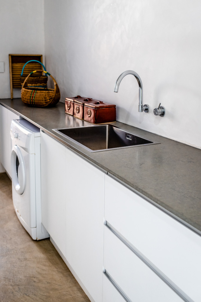 The ample laundry is a functional but stylish space using Polytec Crisp White Legato decorative which provides a smooth, super matt finish. The Quantum Quartz Naturale Concrete engineered stone benchtops reflect the polished concrete floors.